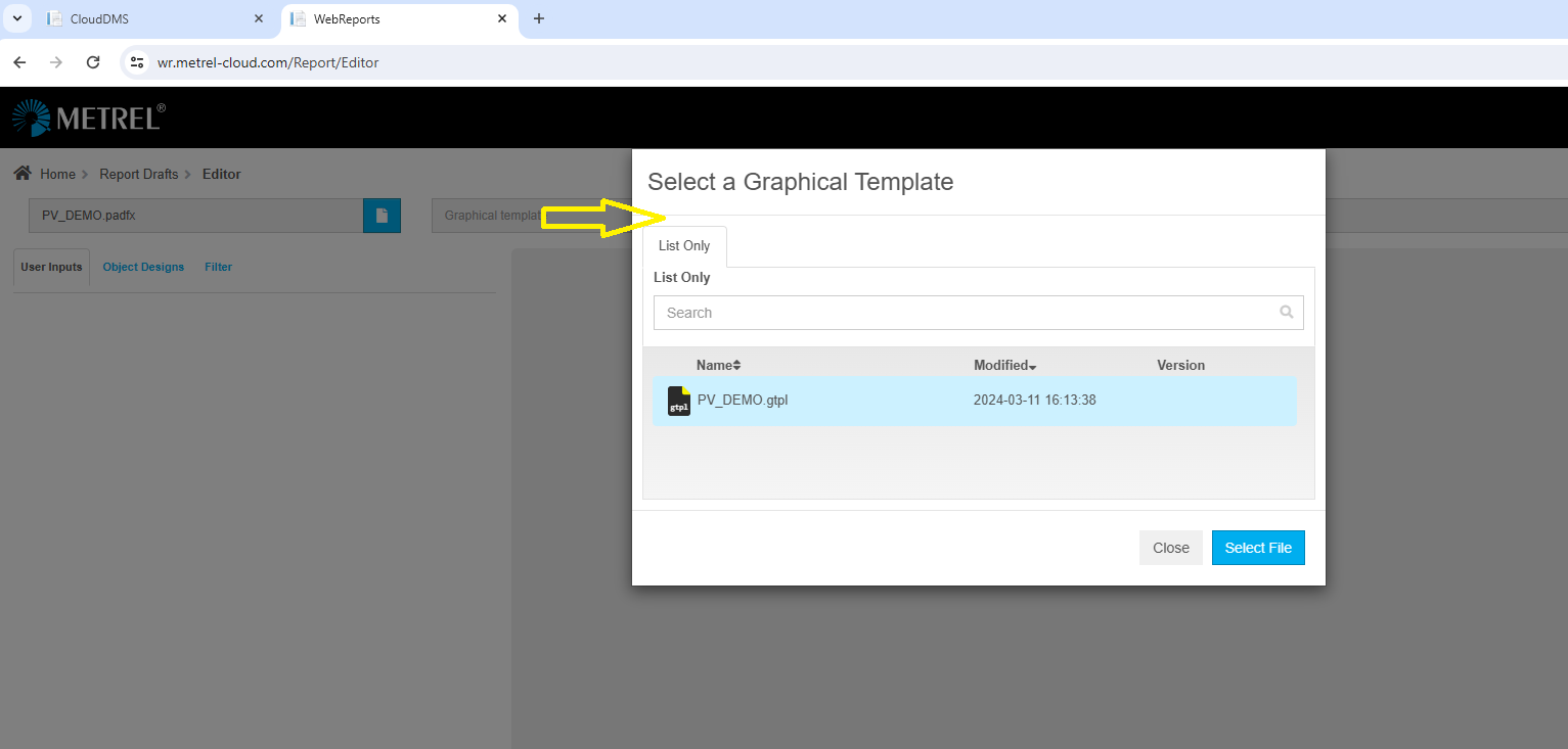 Bei der Arbeit mit einer padfx Datei, die in der Metrel Cloud gespeichert wurde (das Cloud Symbol wird auch neben dem Dateinamen in der Registerkarte MESM angezeigt), erscheint das Fenster Save as nicht, wenn man auf das Symbol für Web reports klickt, sondern nur das Fenster Report Selector, wie unten dargestellt.