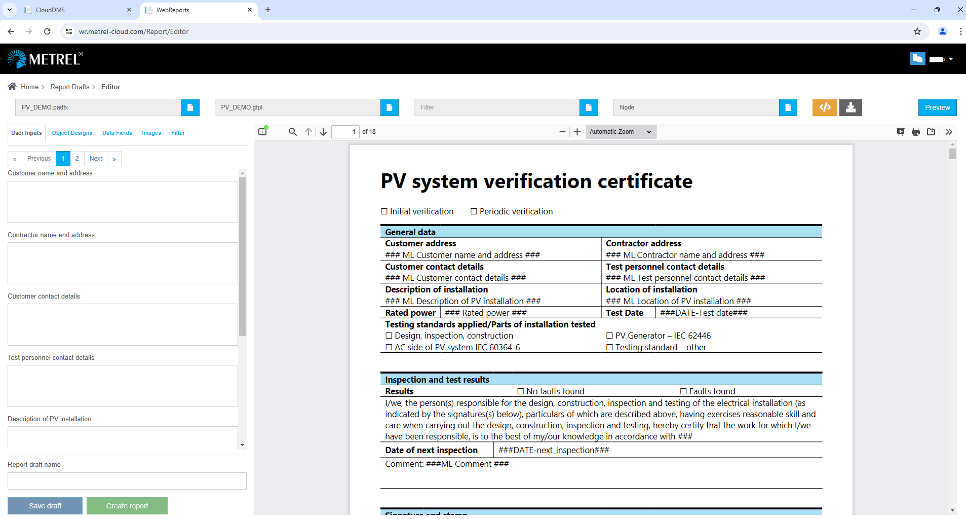Die Cloud-basierte Anwendung WebReports ist ein Werkzeug zur Erstellung und Archivierung von Prüfberichten. Die Anwendung ist ein Teil der Metrel Ecosystem Plattform.