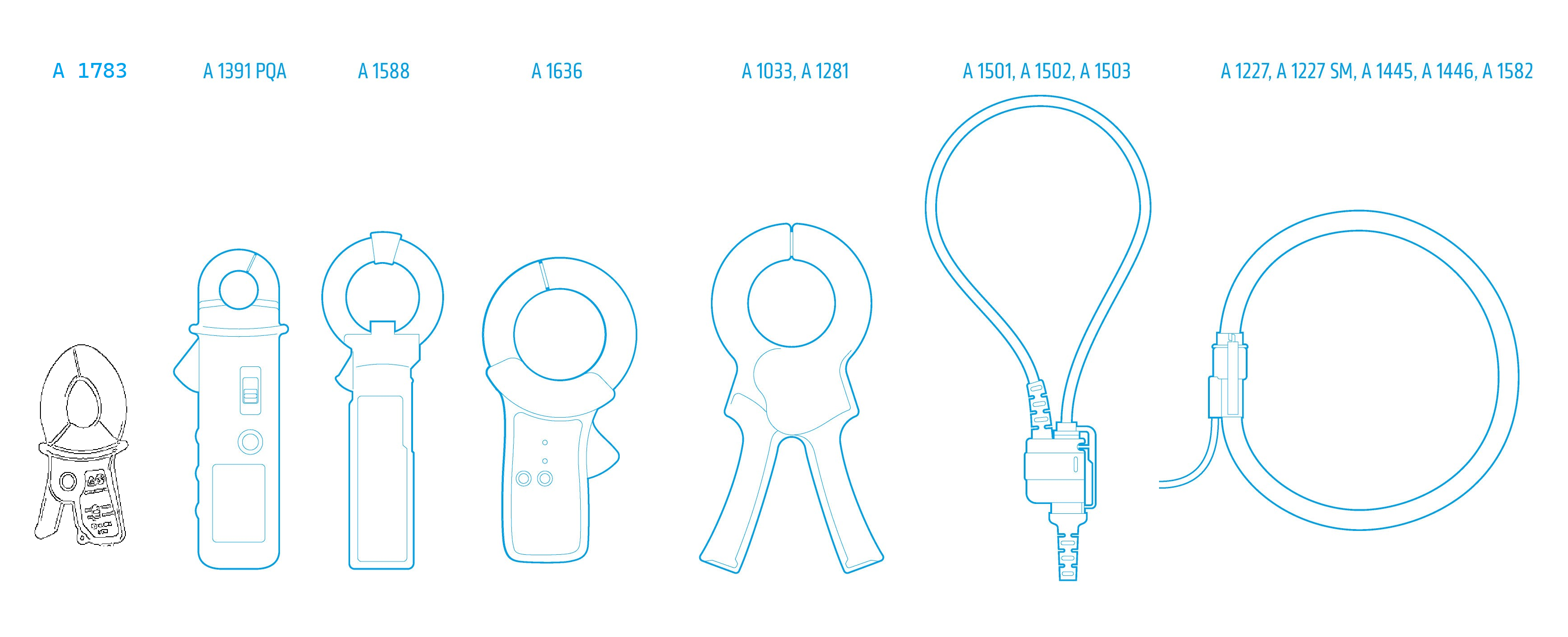 flexible (Flex) Klemmen, die nach dem Prinzip der Rogowski Spule arbeiten: A 1501, A 1502, A 1503, A 1227, A 1227 SM, A 1445, A 1446, A 1582.