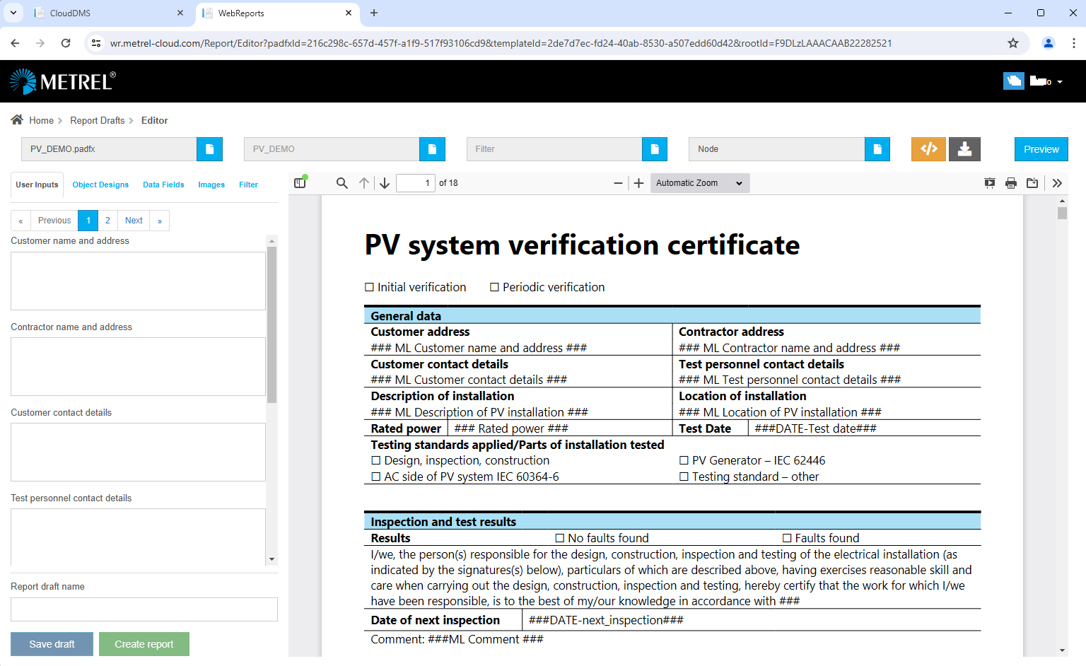 Cloud-based application WebReports is a tool for preparing and archiving test reports. The application is a part of the Metrel Ecosystem platform.