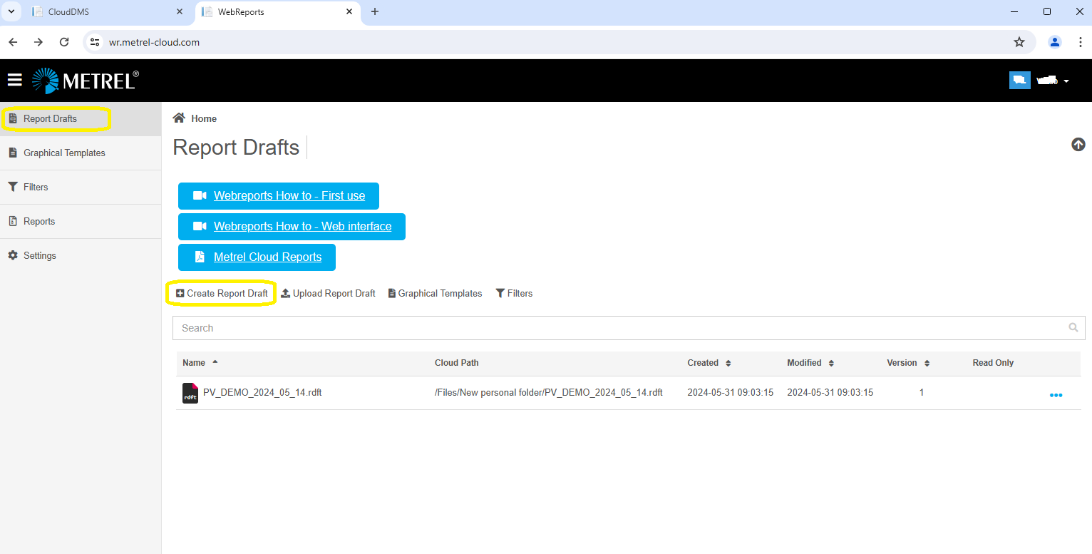 1. On WebReports page (https://wr.metrel-cloud.com/) select Reports Drafts in Menu on the left and click on Create Report Drafts.
