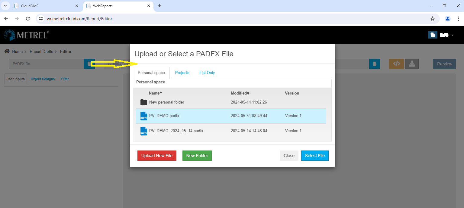 2. Click on PADFX file icon and upload padfx file by clicking on Upload New File or select desired padfx file from Metrel Cloud.