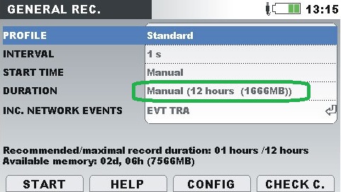 Recording sessions with a registration period of 1 second usually generate huge files (up to a few GB), causing issues with largest supported file size in FAT32 (microSD are formatted to that file system). To mitigate this, an auto recorder restart is implemented in models MI 2893 Power Master XT, MI 2892 Power Master and MI 2885 Master Q4. In other words, when recorder stops due to reaching the maximum available length (set at 1.666 GB), it will automatically start a new recording period.